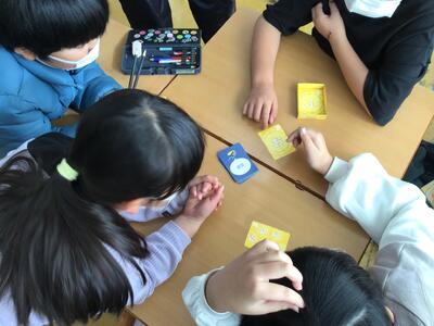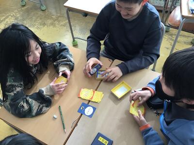 今回は、「ワードスナイパー」というカードを使って、ゲーム形式で3~4名のグループに分かれ活動しました。(縦割り班ごとに各教室に分かれて)