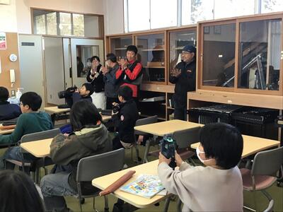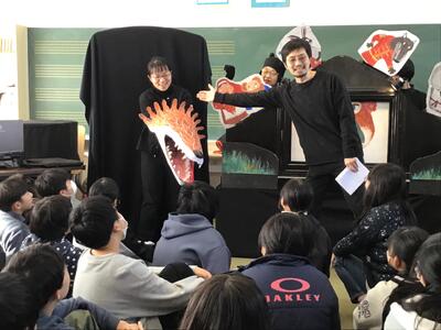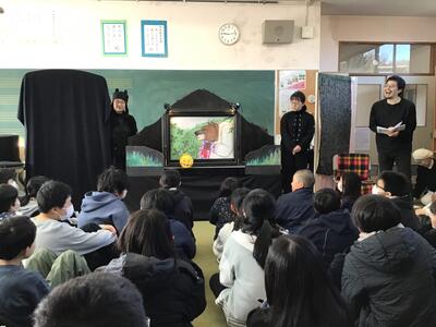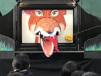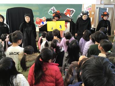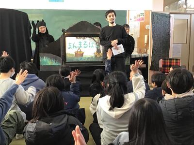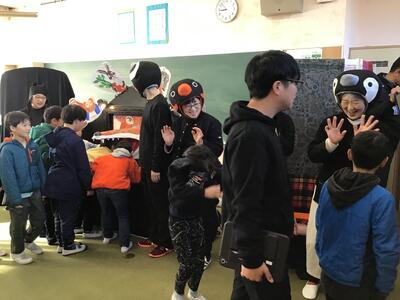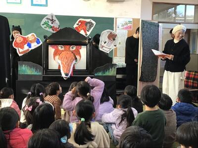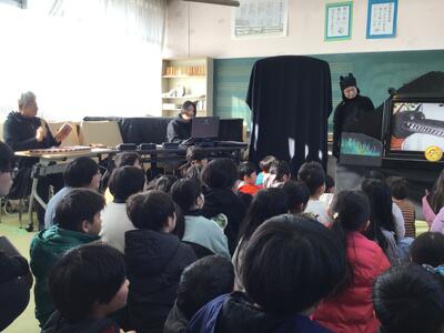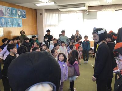 下学年と高学年で反応はそれぞれ異なりましたが、音楽や立体的な演出によって、最後まで興味をもって聞き入っている姿はとても印象的でした。また、効果音を考えさせたり、一緒に「ペンギンたいそう」をしたり、物語の挿入歌を歌ったりと、参加型の読み聞かせで、とっても楽しいひとときを過ごすことができました。ありがとうございました。