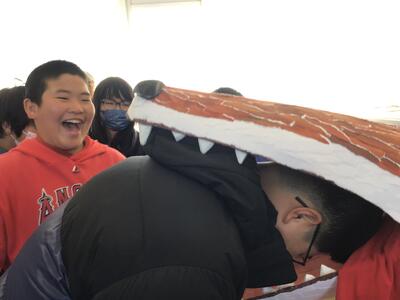 獅子舞ならぬ、オオカミにガブリ。無病息災!