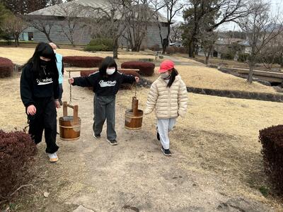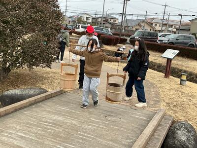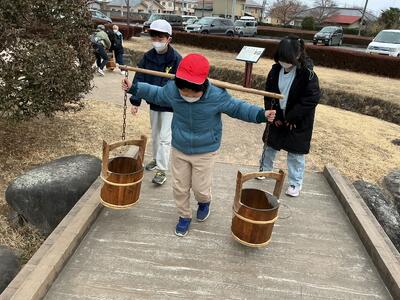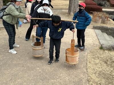 那須野が原博物館・那須疏水公園に行ってきました。那須野が原博物館では、開墾の説明を聞いたり、水運びやモッコ担ぎの体験をしたりしました。那須疏水公園では、140年以上前に作られた旧取水施設を見学しました。見学や体験活動を通して、那須野が原開拓の歴史や、当時の人々の苦労について理解を深めることができました。