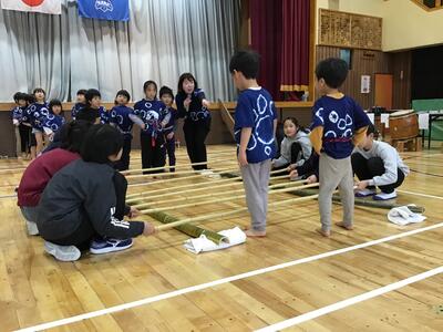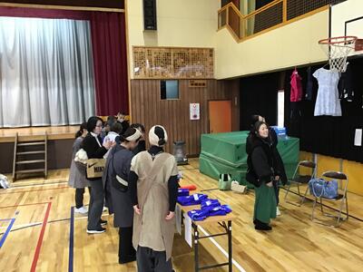 〈6年生の様子。6年生は、体育館等で大人と一緒に催しの準備をしました〉