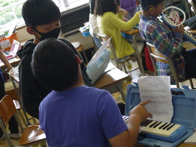 「ペアに聴かせてみよう」学び合うことはできないかもしれませんが、友達が聴いてくれるという状況は意欲が高まるはずです。