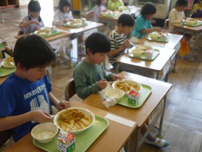 慣れてきたらグループになって給食もあるでしょうね。またそれが楽しいんですよ。いっぱい食べてくださいね。
