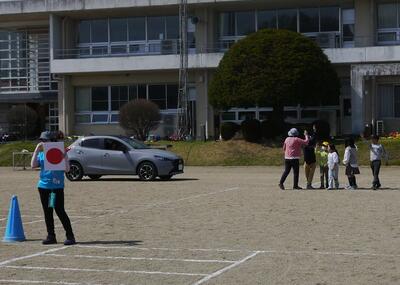 どうやって安全な横断を意識づけさせるか。止まってくれた車へのあいさつも同時に指導です。