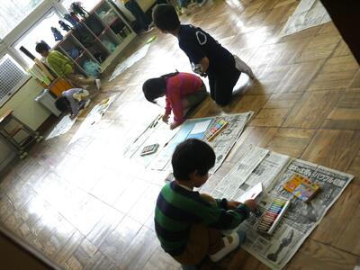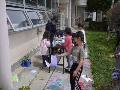 この活動での青空教室は必然でした。担任の先生の先見の明だわ。いっぱい汚していいからね。思い切り表現してごらん。