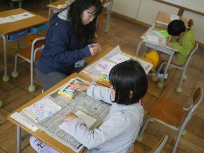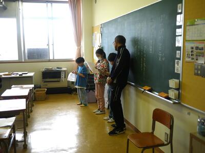 1年生の教室では机上だけの学習ではなく、教室全体を使って学ばせています。