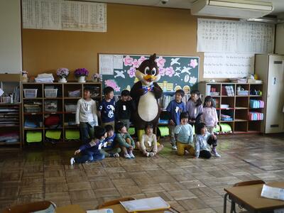 令和6年度最初の授業参観。さてさて、どんな授業をしているかな。1年生の教室には那須町子ども子育て支援事業関連で那須ハイランドパークのウーピー君が来ていました。