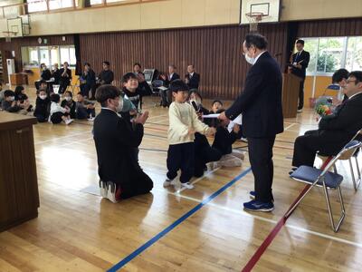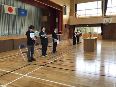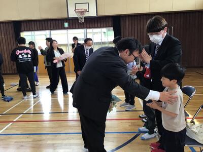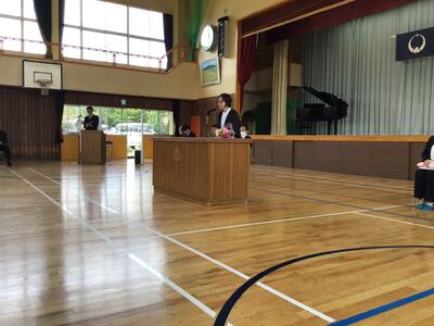 月井教頭先生、大森先生、福島先生、渡邉先生、須藤先生、須佐先生が体育館に入場すると、懐かしさとうれしさで会場全体がほっとした雰囲気に包まれました。代表の子たちのあいさつ、花束贈呈から涙、それぞれの先生方のお話も子供たちは真剣に聞き入っていました。校歌の場面では、元気な歌声を先生方に届けました。今年も、もらい泣きしてしてしまいました。